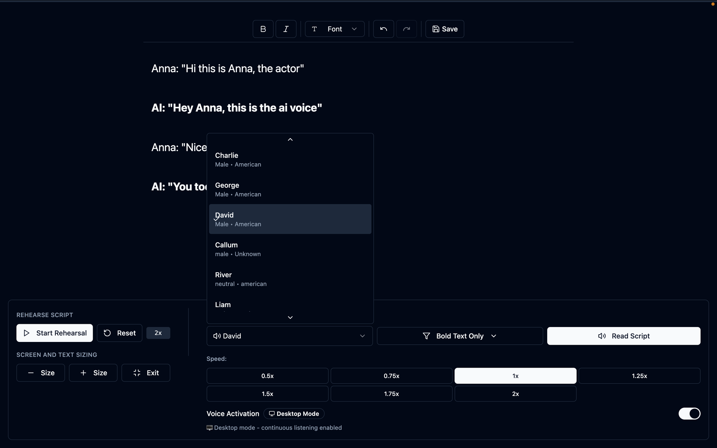 Here is a screenshot of the rehearsal page with the voices from ElevenLabs scroll open in order to view and select a variety of different voices to rehearse from. Actors can actively edit their scrip while rehearsing, view the screen in full, zoom in/out, control speeds, and assign lines for the AI to read by bolding or using italics.